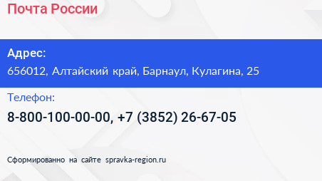 Почта России по адресу 656012, Алтайский край, Барнаул, Кулагина, 25 в дальнейшем Организация, размещена в следующих категориях: