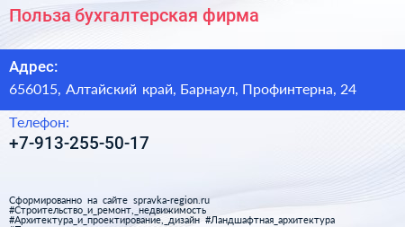 Польза, бухгалтерская фирма по адресу 656015, Алтайский край, Барнаул, Профинтерна, 24 в дальнейшем Организация, размещена в следующих категориях: