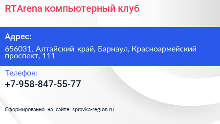 RTArena, компьютерный клуб по адресу 656031, Алтайский край, Барнаул, Красноармейский проспект, 111 в дальнейшем Организация, размещена в следующих категориях:
