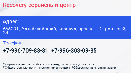 Recovery, сервисный центр по адресу 656031, Алтайский край, Барнаул, проспект Строителей, 34 в дальнейшем Организация, размещена в следующих категориях: