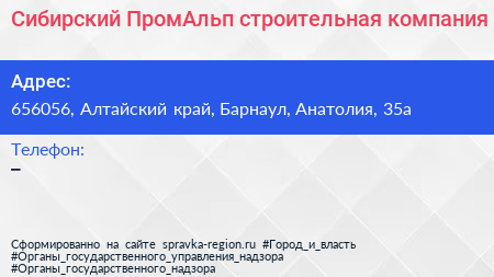 Сибирский ПромАльп, строительная компания по адресу 656056, Алтайский край, Барнаул, Анатолия, 35а в дальнейшем Организация, размещена в следующих категориях: