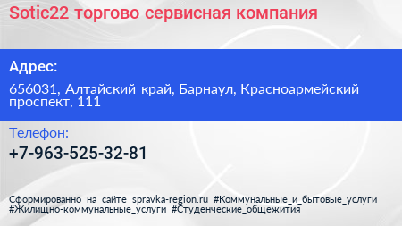 Sotic22, торгово-сервисная компания по адресу 656031, Алтайский край, Барнаул, Красноармейский проспект, 111 в дальнейшем Организация, размещена в следующих категориях: