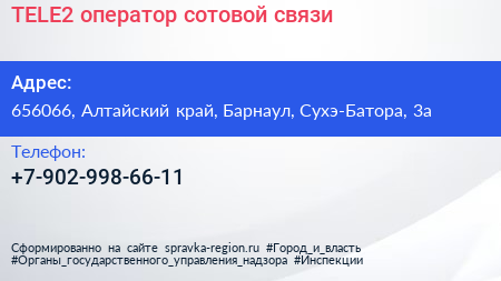 TELE2, оператор сотовой связи по адресу 656066, Алтайский край, Барнаул, Сухэ-Батора, 3а в дальнейшем Организация, размещена в следующих категориях: