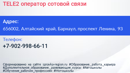 TELE2, оператор сотовой связи по адресу 656002, Алтайский край, Барнаул, проспект Ленина, 93 в дальнейшем Организация, размещена в следующих категориях: