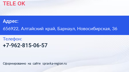 ТELE+OK по адресу 656922, Алтайский край, Барнаул, Новосибирская, 36 в дальнейшем Организация, размещена в следующих категориях: