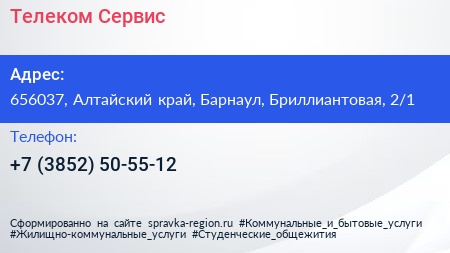 Телеком-Сервис по адресу 656037, Алтайский край, Барнаул, Бриллиантовая, 2/1 в дальнейшем Организация, размещена в следующих категориях: