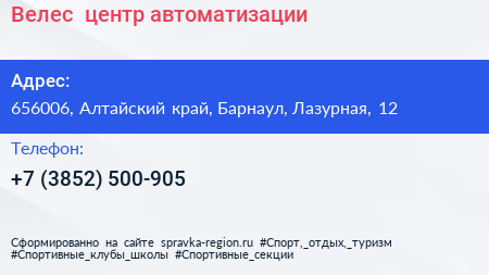Велес+, центр автоматизации по адресу 656006, Алтайский край, Барнаул, Лазурная, 12 в дальнейшем Организация, размещена в следующих категориях: