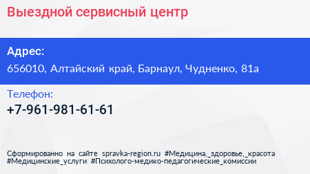 Выездной сервисный центр по адресу 656010, Алтайский край, Барнаул, Чудненко, 81а в дальнейшем Организация, размещена в следующих категориях: