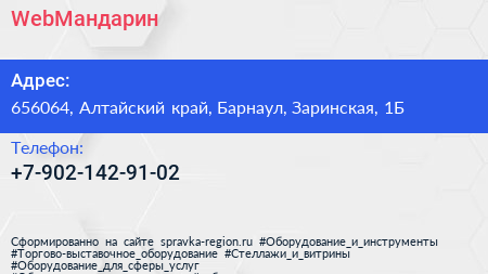WebМандарин по адресу 656064, Алтайский край, Барнаул, Заринская, 1Б в дальнейшем Организация, размещена в следующих категориях: