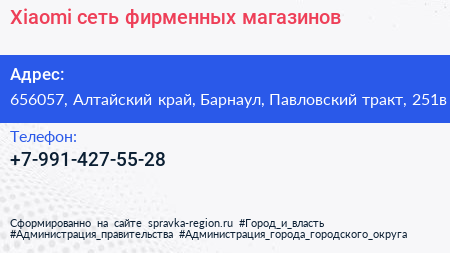 Xiaomi, сеть фирменных магазинов по адресу 656057, Алтайский край, Барнаул, Павловский тракт, 251в в дальнейшем Организация, размещена в следующих категориях: