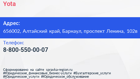 Yota по адресу 656002, Алтайский край, Барнаул, проспект Ленина, 102в в дальнейшем Организация, размещена в следующих категориях: