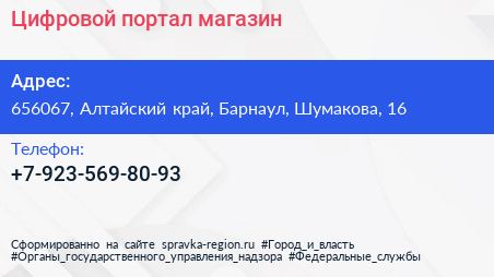 Цифровой портал, магазин по адресу 656067, Алтайский край, Барнаул, Шумакова, 16 в дальнейшем Организация, размещена в следующих категориях: