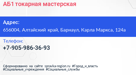 АБ1, токарная мастерская по адресу 656004, Алтайский край, Барнаул, Карла Маркса, 124а в дальнейшем Организация, размещена в следующих категориях: