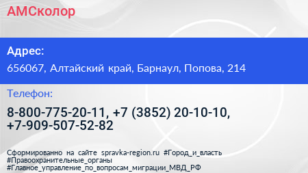 АМСколор по адресу 656067, Алтайский край, Барнаул, Попова, 214 в дальнейшем Организация, размещена в следующих категориях: