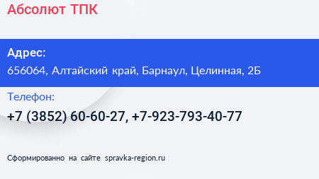 Абсолют ТПК по адресу 656064, Алтайский край, Барнаул, Целинная, 2Б в дальнейшем Организация, размещена в следующих категориях: