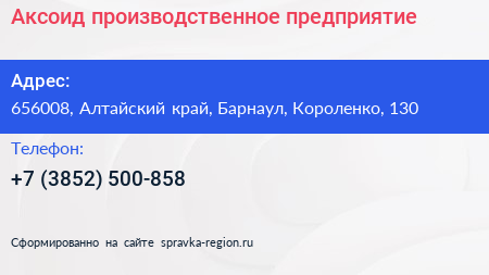 Аксоид, производственное предприятие по адресу 656008, Алтайский край, Барнаул, Короленко, 130 в дальнейшем Организация, размещена в следующих категориях: