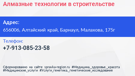 Алмазные технологии в строительстве по адресу 656006, Алтайский край, Барнаул, Малахова, 175г в дальнейшем Организация, размещена в следующих категориях: