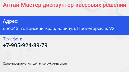 Алтай Мастер, дискаунтер кассовых решений по адресу 656043, Алтайский край, Барнаул, Пролетарская, 92 в дальнейшем Организация, размещена в следующих категориях: