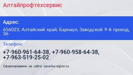 Алтайпрофтехсервис по адресу 656023, Алтайский край, Барнаул, Заводской 9-й проезд, 36 в дальнейшем Организация, размещена в следующих категориях: