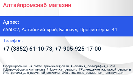 Алтайпромснаб, магазин по адресу 656002, Алтайский край, Барнаул, Профинтерна, 44 в дальнейшем Организация, размещена в следующих категориях: