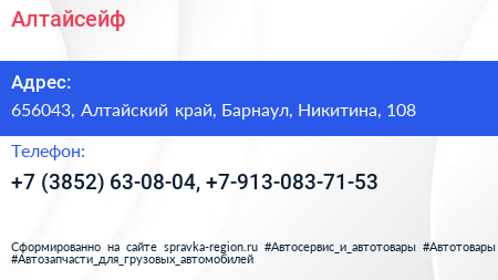 Алтайсейф по адресу 656043, Алтайский край, Барнаул, Никитина, 108 в дальнейшем Организация, размещена в следующих категориях: