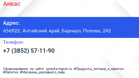 Анкас по адресу 656922, Алтайский край, Барнаул, Попова, 242 в дальнейшем Организация, размещена в следующих категориях: