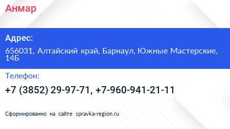 Анмар по адресу 656031, Алтайский край, Барнаул, Южные Мастерские, 14Б в дальнейшем Организация, размещена в следующих категориях: