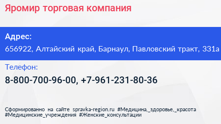 Яромир, торговая компания по адресу 656922, Алтайский край, Барнаул, Павловский тракт, 331а в дальнейшем Организация, размещена в следующих категориях: