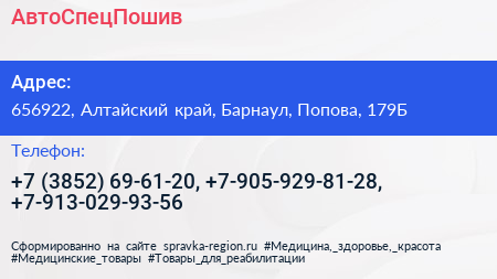 АвтоСпецПошив по адресу 656922, Алтайский край, Барнаул, Попова, 179Б в дальнейшем Организация, размещена в следующих категориях: