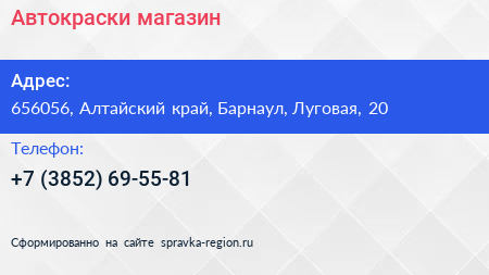 Автокраски, магазин по адресу 656056, Алтайский край, Барнаул, Луговая, 20 в дальнейшем Организация, размещена в следующих категориях: