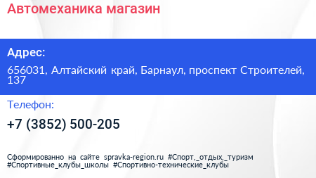 Автомеханика, магазин по адресу 656031, Алтайский край, Барнаул, проспект Строителей, 137 в дальнейшем Организация, размещена в следующих категориях: