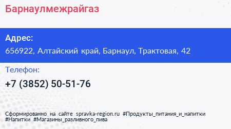 Барнаулмежрайгаз по адресу 656922, Алтайский край, Барнаул, Трактовая, 42 в дальнейшем Организация, размещена в следующих категориях: