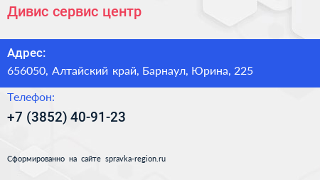 Дивис, сервис-центр по адресу 656050, Алтайский край, Барнаул, Юрина, 225 в дальнейшем Организация, размещена в следующих категориях: