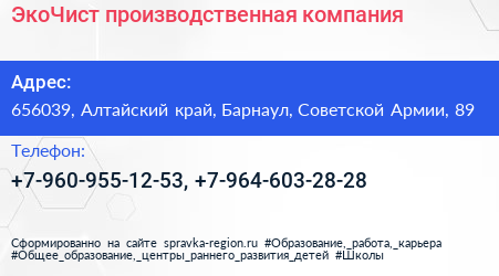 ЭкоЧист, производственная компания по адресу 656039, Алтайский край, Барнаул, Советской Армии, 89 в дальнейшем Организация, размещена в следующих категориях:
