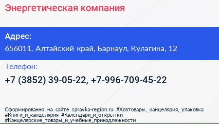 Энергетическая компания по адресу 656011, Алтайский край, Барнаул, Кулагина, 12 в дальнейшем Организация, размещена в следующих категориях: