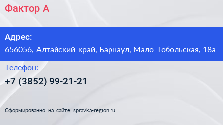 Фактор-А по адресу 656056, Алтайский край, Барнаул, Мало-Тобольская, 18а в дальнейшем Организация, размещена в следующих категориях: