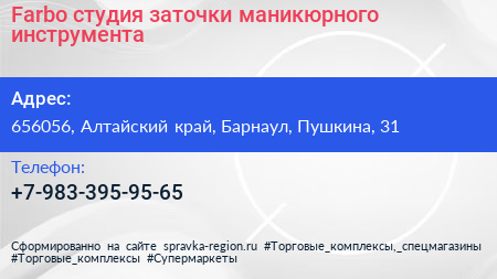 Farbo, студия заточки маникюрного инструмента по адресу 656056, Алтайский край, Барнаул, Пушкина, 31 в дальнейшем Организация, размещена в следующих категориях: