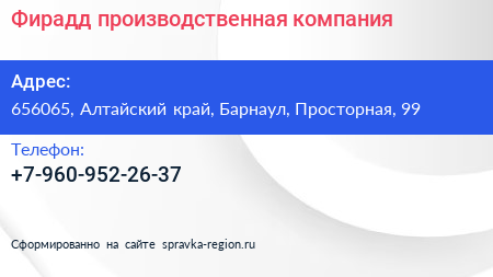 Фирадд, производственная компания по адресу 656065, Алтайский край, Барнаул, Просторная, 99 в дальнейшем Организация, размещена в следующих категориях: