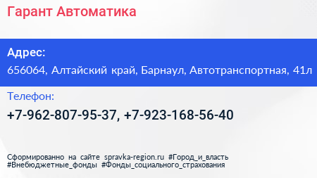 Гарант-Автоматика по адресу 656064, Алтайский край, Барнаул, Автотранспортная, 41л в дальнейшем Организация, размещена в следующих категориях: