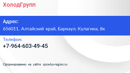 ХолодГрупп по адресу 656011, Алтайский край, Барнаул, Кулагина, 8к в дальнейшем Организация, размещена в следующих категориях: