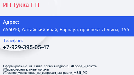 ИП Тукка Г.П. по адресу 656010, Алтайский край, Барнаул, проспект Ленина, 195 в дальнейшем Организация, размещена в следующих категориях:
