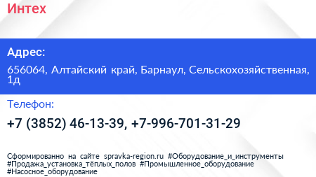 Интех по адресу 656064, Алтайский край, Барнаул, Сельскохозяйственная, 1д в дальнейшем Организация, размещена в следующих категориях: