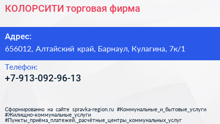 КОЛОРСИТИ, торговая фирма по адресу 656012, Алтайский край, Барнаул, Кулагина, 7к/1 в дальнейшем Организация, размещена в следующих категориях: