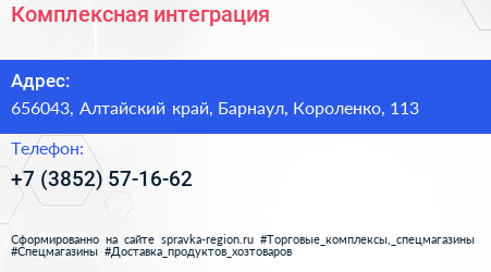 Комплексная интеграция по адресу 656043, Алтайский край, Барнаул, Короленко, 113 в дальнейшем Организация, размещена в следующих категориях:
