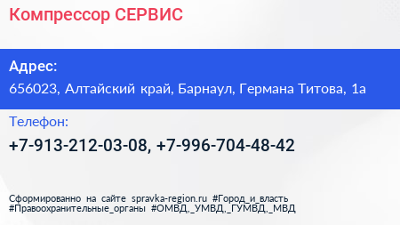Компрессор СЕРВИС по адресу 656023, Алтайский край, Барнаул, Германа Титова, 1а в дальнейшем Организация, размещена в следующих категориях:
