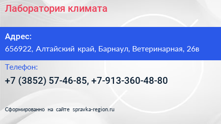 Лаборатория климата по адресу 656922, Алтайский край, Барнаул, Ветеринарная, 26в в дальнейшем Организация, размещена в следующих категориях: