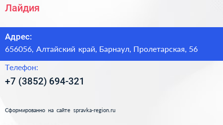 Лайдия по адресу 656056, Алтайский край, Барнаул, Пролетарская, 56 в дальнейшем Организация, размещена в следующих категориях: