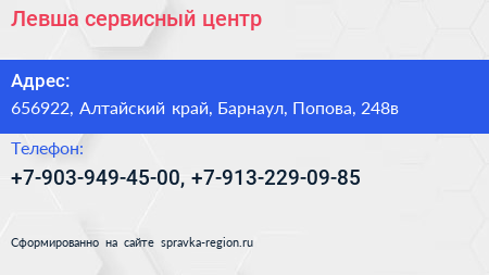 Левша, сервисный центр по адресу 656922, Алтайский край, Барнаул, Попова, 248в в дальнейшем Организация, размещена в следующих категориях: