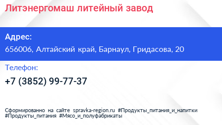 Литэнергомаш, литейный завод по адресу 656006, Алтайский край, Барнаул, Гридасова, 20 в дальнейшем Организация, размещена в следующих категориях: