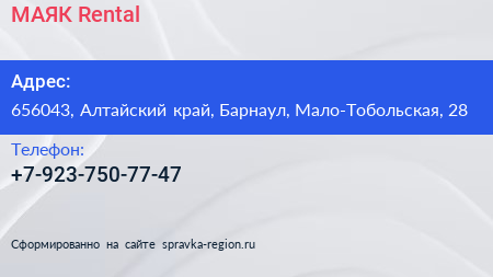 МАЯК Rental по адресу 656043, Алтайский край, Барнаул, Мало-Тобольская, 28 в дальнейшем Организация, размещена в следующих категориях:
